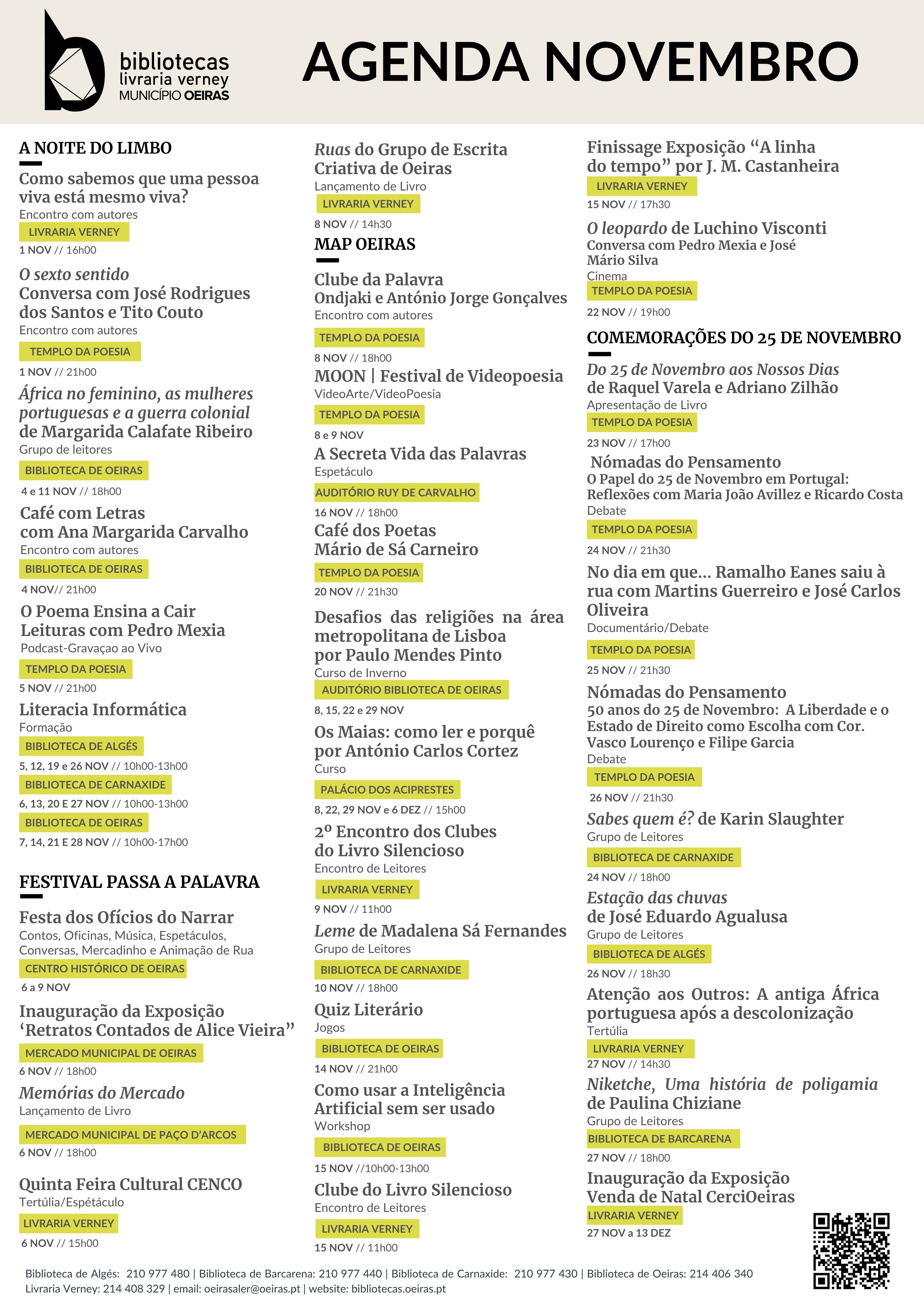 O mês de novembro traz às bibliotecas de Oeiras uma programação diversificada, pensada para todas as idades: encontros com autores, lançamentos de livros, oficinas, concertos, tertúlias, jogos e muitas outras atividades culturais.📖