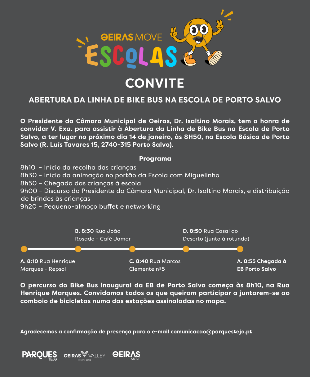 No dia 14 de janeiro, o Município de Oeiras em parceria com a Parques Tejo assinala a abertura da Linha de Bike Bus na Escola Básica de Porto Salvo, uma iniciativa integrada no programa Oeiras Move Escolas, que promove a mobilidade ativa, reforça a autonomia das crianças e incentiva a adoção de estilos de vida saudáveis.