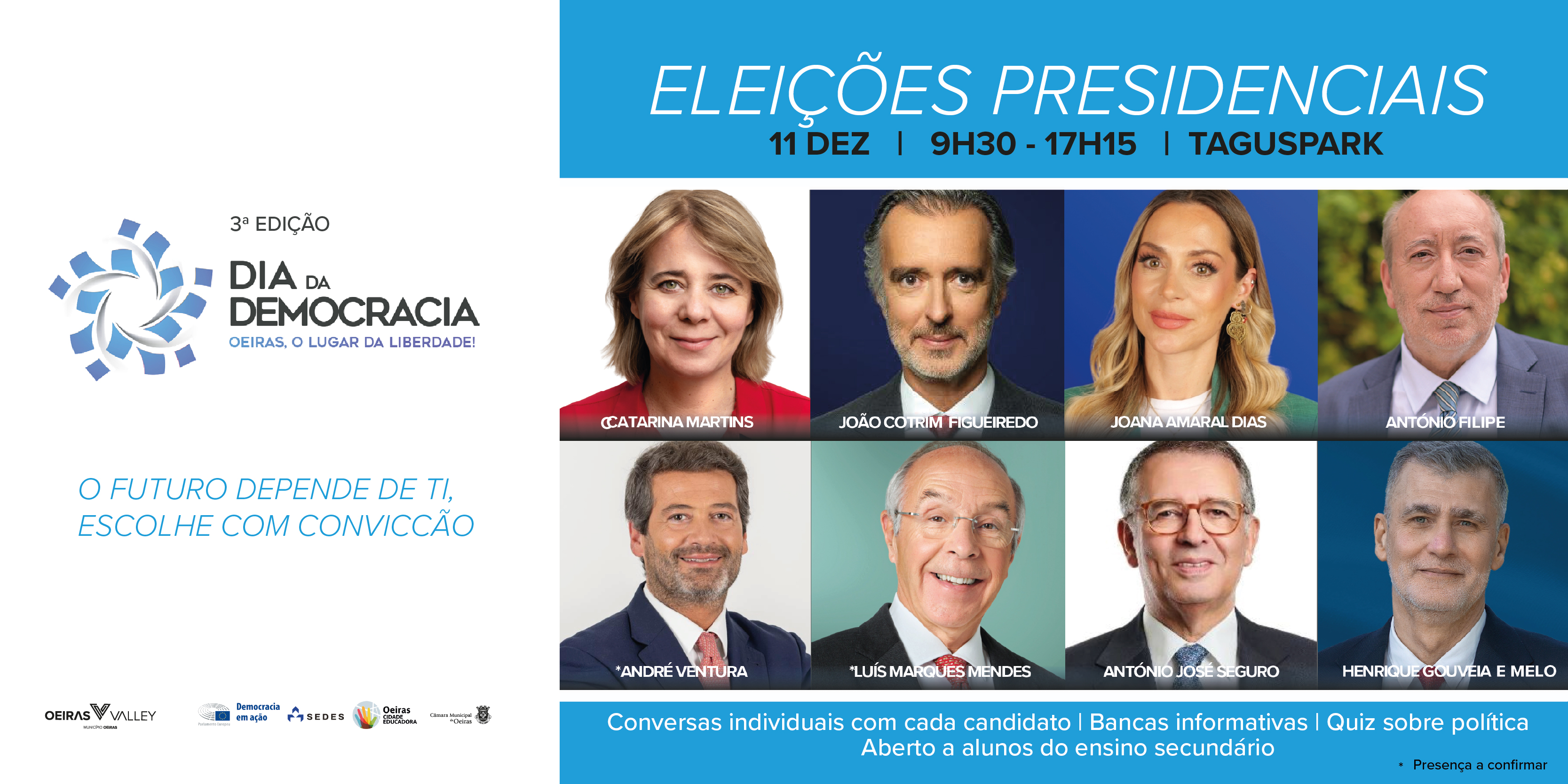 O 'Dia da Democracia' regressa a Oeiras para uma 3ª edição especial dedicada às eleições Presidenciais. Trata-se de uma única sessão que terá lugar no Taguspark e onde vais poder conhecer e conversar com os candidatos às Eleições Presidenciais de 2026. Além das apresentações formais, estão previstas conversas individuais com cada candi... ver mais